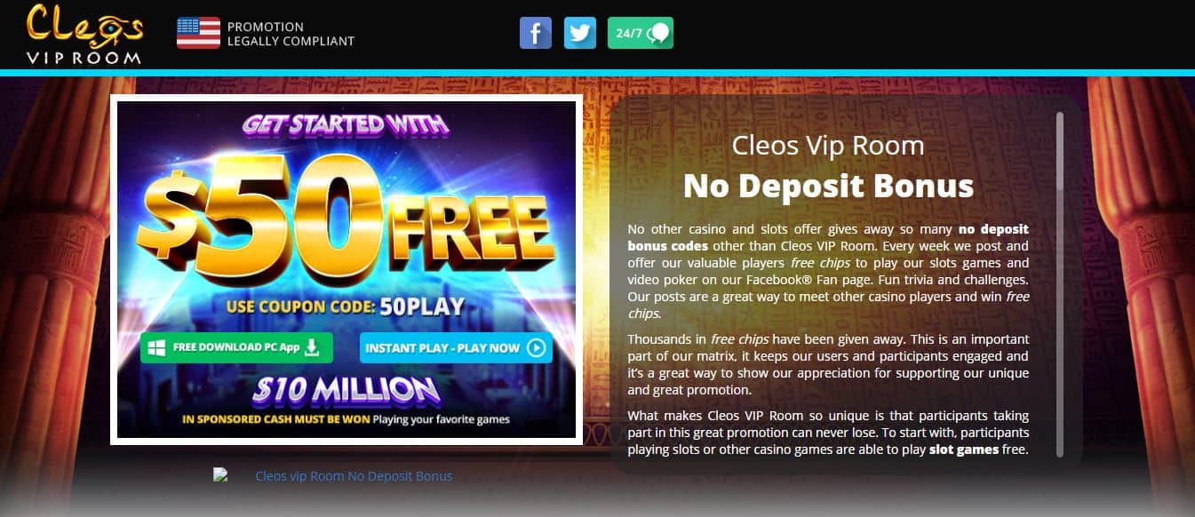 Vip Room Casino Cleos VIP Room Casino No Deposit Bonus Code $50 free chips All roads lead to free chips on Cleos VIP Room. You can claim free chips in different ways: Signup and use coupon code 50PLAY to receive $50 free chips you can use to play, win and cashout. Send an email to receive $5 free chips.